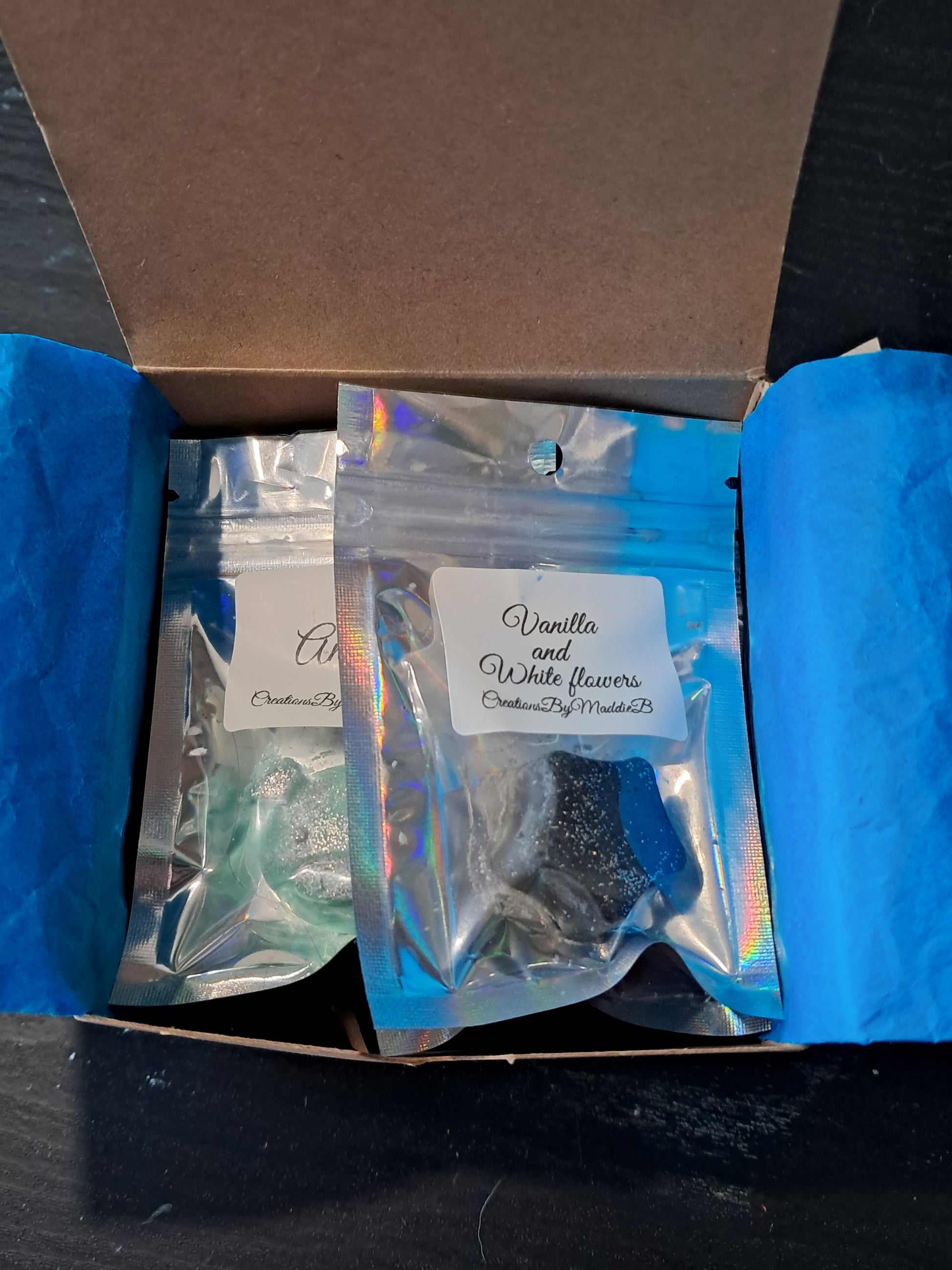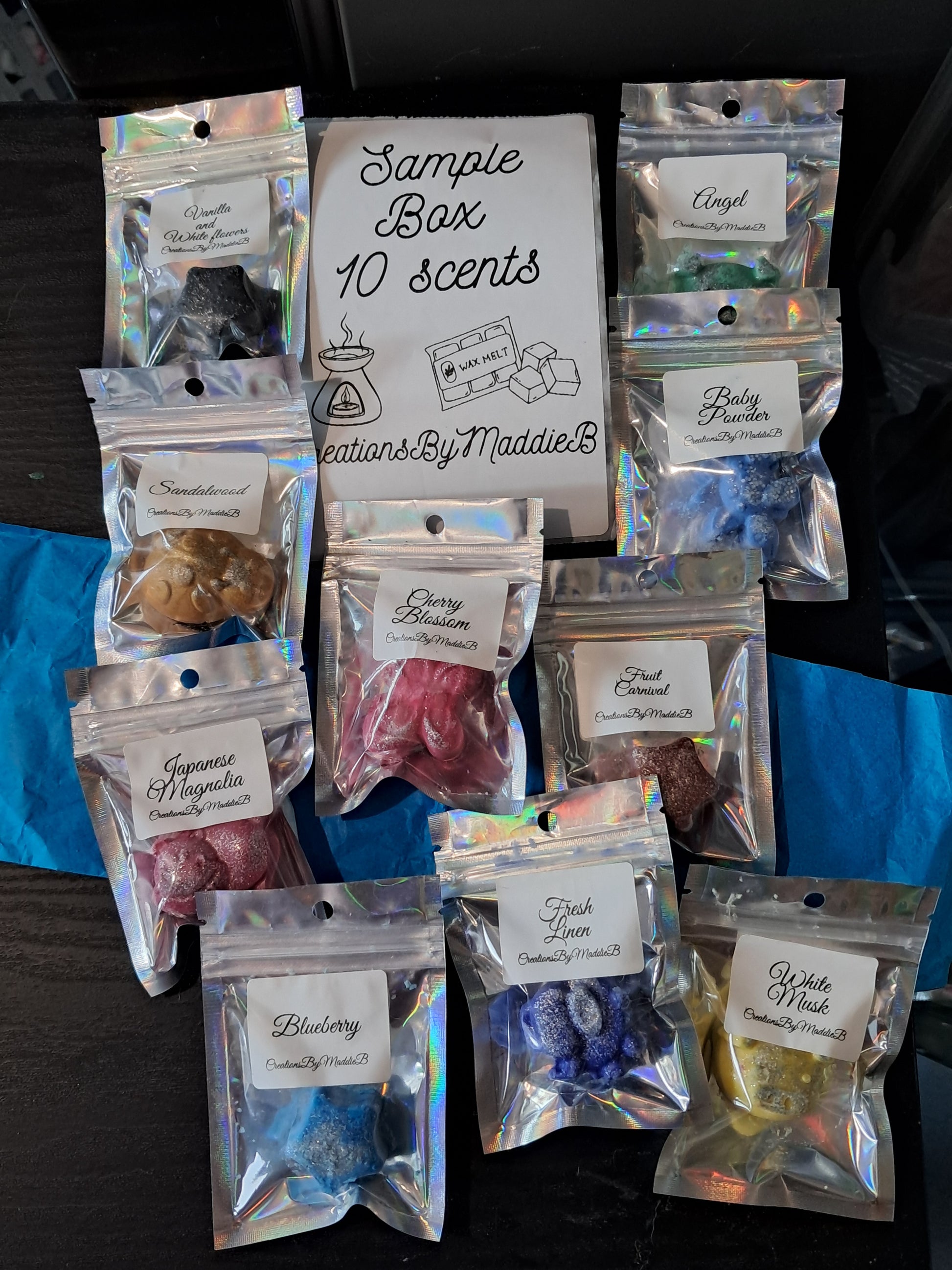 Experience an array of delightful scents with our Sample Box of 10 Wax Melts. Each box contains a variety of random scents, providing a new sensory experience every time. Perfect for trying out different fragrances or as a gift for wax melt lovers.